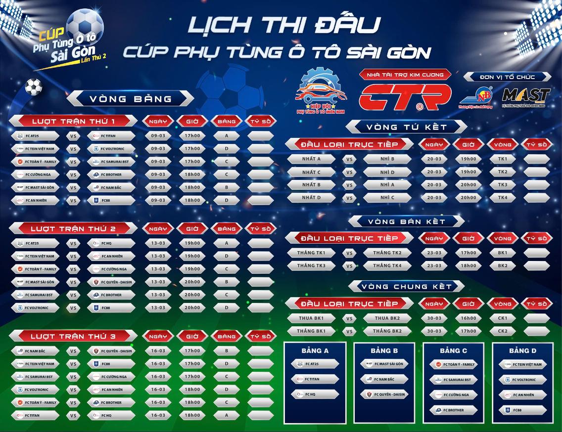 LỊCH THI ĐẤU CHÍNH THỨC - CÚP PHỤ TÙNG Ô TÔ SÀI GÒN LẦN 2