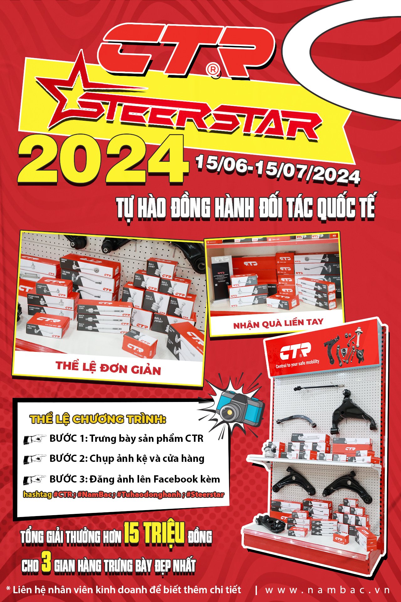 TRƯNG BÀY CÙNG CTR QUỐC TẾ - NHẬN QUÀ BAO LA VƯƠN TẦM GIAN HÀNG VIỆT RA BIỂN LỚNCTR – Một thương hiệu đã quá quen thuộc với khách hàng trong việc cung cấp các sản phẩm phụ tùng toàn cầu. Trở thành đối tác chiến lược của CTR Hàn Quốc - NAM BẮC tự hào đại diện đồng hành cùng với Khách hàng CTR , Tập đoàn CTR HÀN QUỐC , CTR VINA mang đến sự kiện trưng bày mang tính quốc tế - nơi khách hàng tham gia thể hiện các gian hàng Việt Nam về CTR có thể vươn ra Hàn Quốc - Châu Á nói riêng và Thế giới nói chung. CUỘC THI TRƯNG BÀY SẢN PHẨM ĐẸP “CTR STEERSTAR 2024 - TỰ HÀO ĐỒNG HÀNH ĐỐI TÁC QUỐC TẾ” được CTR phối hợp cùng NAM BẮC chính thức khởi động là cơ hội quảng bá hình ảnh sản phẩm chuyên nghiệp và tạo sân chơi cho khách hàng thể hiện được kinh nghiệm, sự sáng tạo trong việc trưng bày gian hàng, kệ hàng giới thiệu sản phẩm cũng để thu hút khách hàng đến với chuỗi cửa hàng kinh doanh của quý khách.%THỂ LỆ ĐƠN GIẢN, NHẬN QUÀ LIỀN TAY!!!%Đối tượng áp dụng: Tất cả khách hàng có kinh doanh sản phẩm thương hiệu CTR toàn thế giớiThời gian: - Thời gian đăng ký 1/6 đến 12/6/2024.- Thời gian chương trình 15/6 đến 15/7/2024.Tham gia vô cùng đơn giản:Bước 1: Trưng bày sản phẩm CTR trên kệ, tủ tại cửa hàng, showroom mình kinh doanh, thể hiện hình ảnh thương hiệu logo của CTR.Bước 2: Chụp 2 tấm ảnh (1 tấm là mặt tiền kinh doanh, 1 tấm là hình kệ trưng bày CTR).Bước 3: Đăng lên Facebook, chế độ công khai, kèm hashtag chương trình #tuhaodonghanh#CTR#NamBac#STEERSTAR(Đối với đối tượng tham gia không dùng MXH, có thể chuyển hình trực tiếp đến kinh doanh phụ trách của mình, KD sẽ chuyển BTC hình ảnh dự thi + địa chỉ KD của khách để BTC đăng bài)o Ban tổ chức sẽ nhận bộ ảnh đẹp do khách hàng cung cấp để làm cơ sở bình chọn.o Tập đoàn CTR sẽ phối hợp với NAM BẮC thăm hỏi khách hàng và tham khảo cách trưng bày của khách hàng tham dự.o Ban tổ chức được sử dụng hình ảnh tham dự cuộc thi cho các mục đích khác. GIẢI THƯỞNG: - Tất cả đối tượng tham gia sẽ được hỗ trợ MIỄN PHÍ một băng rôn cao cấp thương hiệu CTR để trưng bày.- Tất cả đối tượng tham gia sẽ được hỗ trợ chương trình GIẢM 8% trị giá đơn hàng cho tất cả các dòng sản phẩm CTR, lưu ý mỗi khách hàng chỉ được mua duy nhất 1 đơn hàng tại chương trình.- 3 giải thưởng HẤP DẪN, mỗi giải thưởng trị giá 5 triệu.- Ban tổ chức sẽ liên hệ trực tiếp với người trúng giải để xác nhận phần thưởng. Cùng sáng tạo ngay những bức ảnh đẹp và nhận quà cùng Nam Bắc CTR quốc tế thôi nào!!! Liên hệ ngay Chuyên viên kinh doanh của chúng tôi để biết thêm chi tiết chương trình.#phụtùngchínhhãng#thươnghiệuchínhhãng#phutungoto#noithatoto#NamBac#CTR#CTRSTEERSTAR2024~~~~~~~~~~~~~~~~~~~~~
